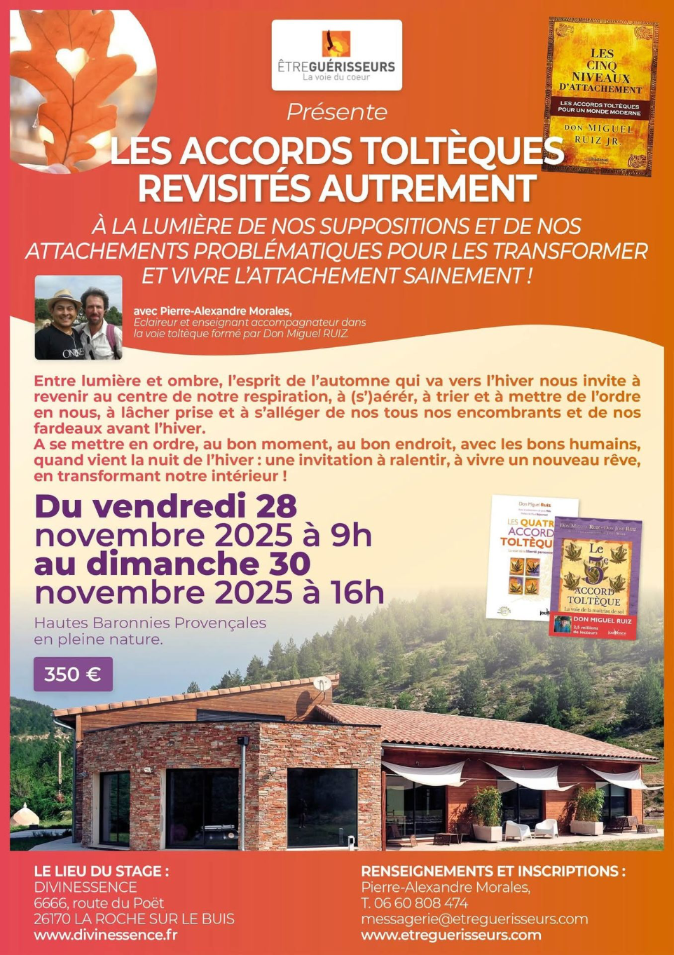 Vous regarderez vos suppositions et vos attachements à la lumière des enseignements toltèques en résonnance avec les types d’attachement psychanalytiques. Transformer ses attachements malsains en attachements sains vous permettra une liberté personnelle plus grande et une mise en ordre en vous et autour de vous afin de vivre en paix, en bonne santé, équilibré, centré et aligné.